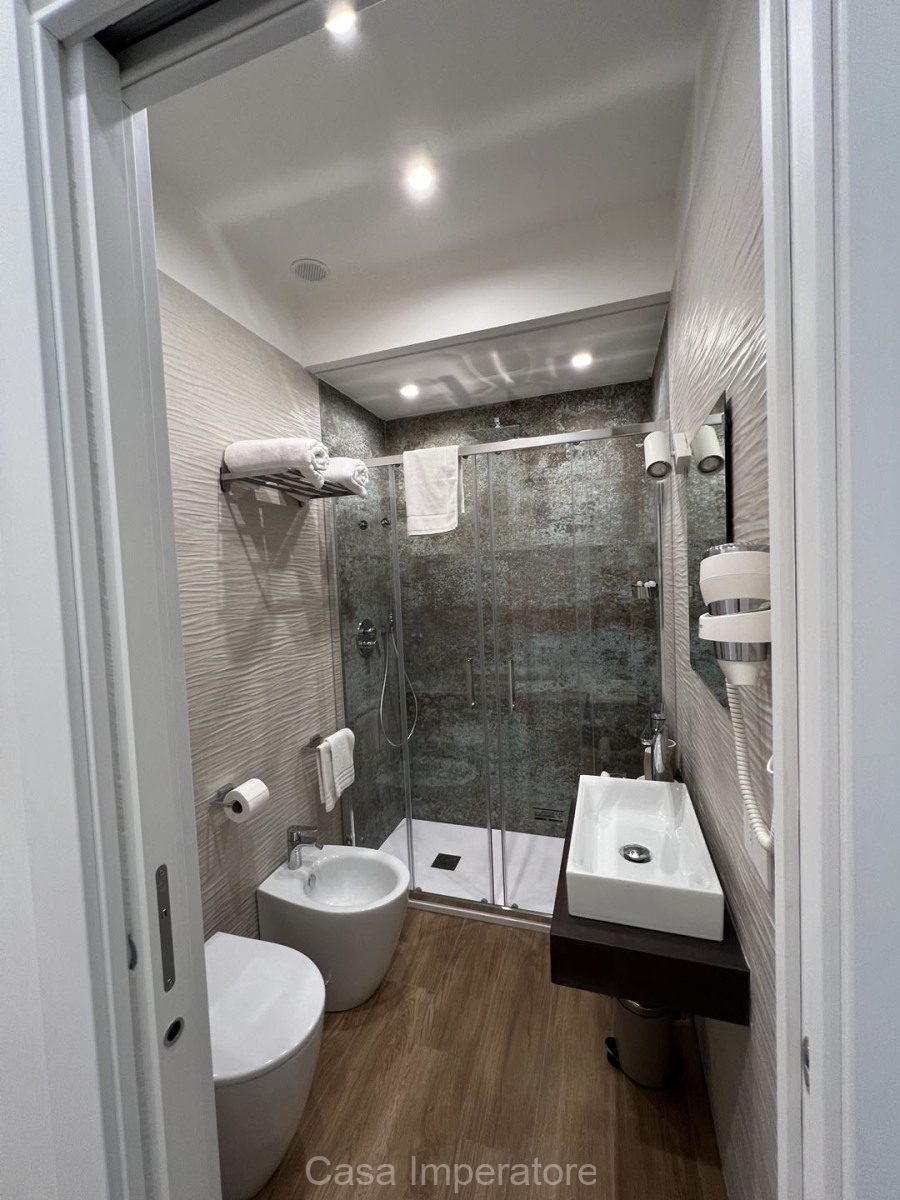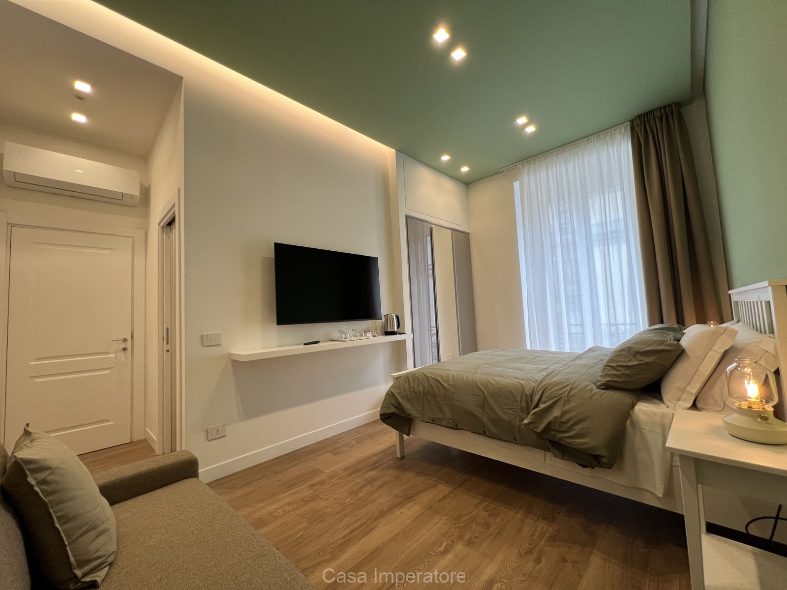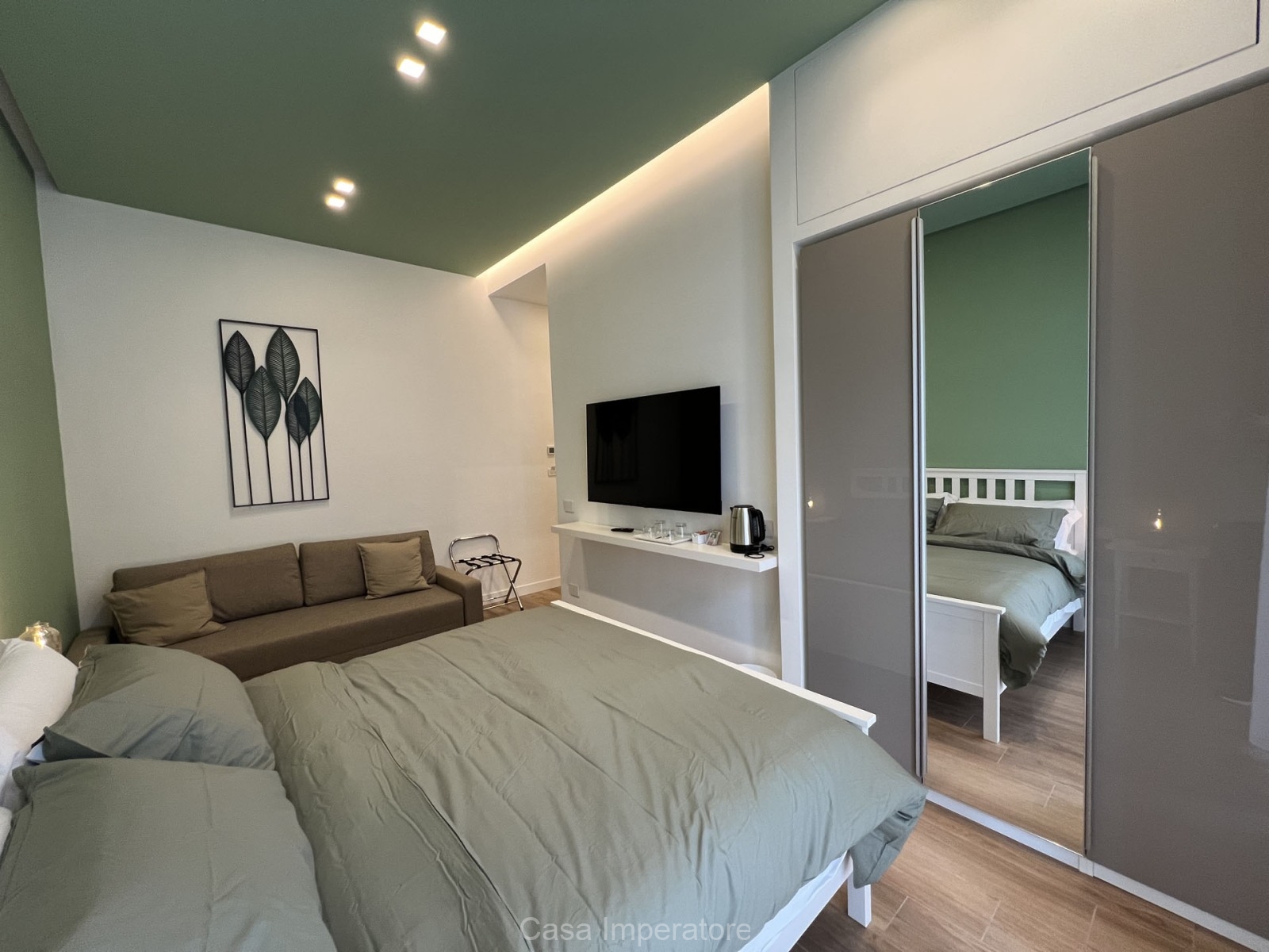 La Camera Ischia offre un ambiente moderno e flessibile, ideale per 2 persone e trasformabile per accoglierne fino a 4. Presenta pareti verdi e arredi minimalisti con un letto matrimoniale e un divano letto, completati da un bagno privato moderno e una TV a schermo piatto. Questa camera è perfetta per coppie o piccoli gruppi in cerca di un soggiorno confortevole con la possibilità di ospitare ospiti aggiuntivi.